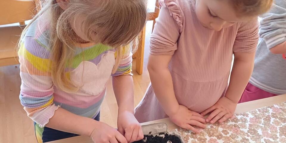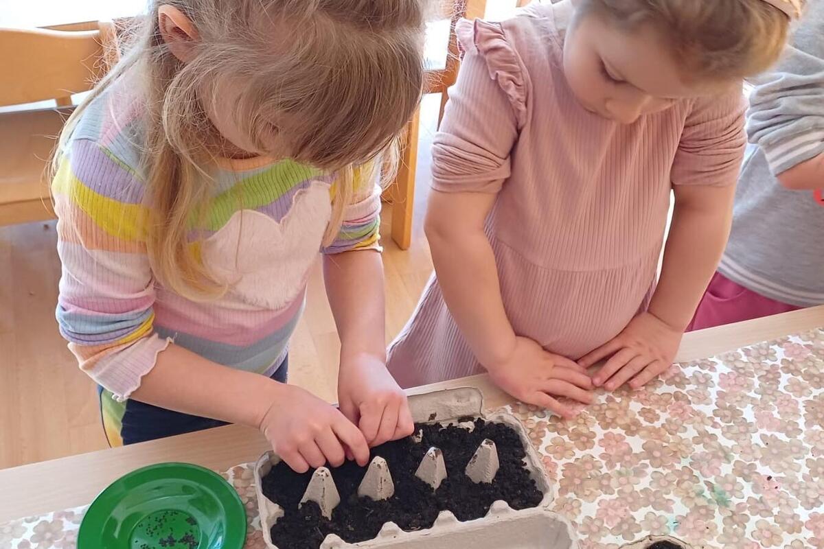 Bei den Knirpsen wurden Tomaten und Basilikum gesät. Sehr vorsichtig legten die Kinder jedes Samenkorn in die Eierpappen hinein. Auch hier dachten die Kinder jeden Tag ans Gießen und betrachteten aufmerksam die Schalen und freuten sich über die ersten Pflanzenspitzen, die aus der Erde trieben.