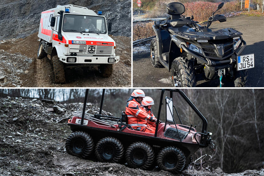 Die Spezialfahrzeuge unserer UNIKE (UNIverselle Katastrophenschutz-Einheit) live und in Farbe erleben? Diese Chance bietet sich allen Besucherinnen und Besuchern der "112 Rescue", der neuen Fachmesse für Rettungswesen und Katastrophenschutz in Dortmund. Vom 14. bis 17. Juni sind die Johanniter aus NRW in den Westfalenhallen unter anderem mit einem großen Stand auf dem Außengelände der Messe vertreten und präsentieren dort einige Fahrzeuge unserer geländegängigen Spezialeinheit – neben Unimog-Rettungswagen, Pritschenfahrzeug, Radlader und Kühlanhänger auch das All-Terrain-Vehicle "UForce 1000" mit Schleifkorbtrage sowie das neue Amphibienfahrzeug "Argo Avenger".