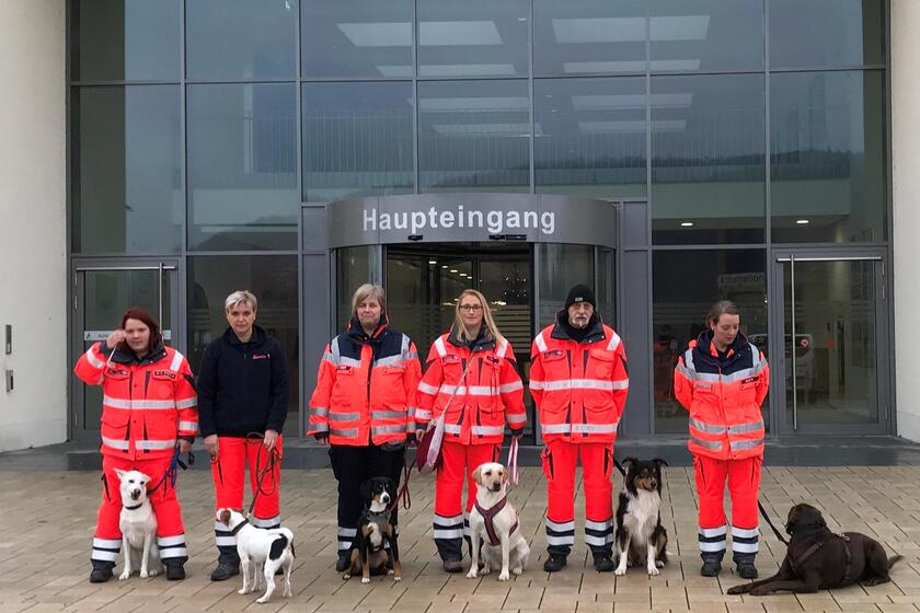 Während die Rettungshundestaffel an den Feiertagen für etwas Abwechslung im Klinikalltag sorgte, übernimmt die Katastrophenschutz-Einheit das restliche Jahr über andere Aufgaben: So unterstützen die Rettungshunde die Einsatzkräfte tatkräftig bei der Suche nach vermissten oder verunglückten Personen, denn die ausgebildeten Vierbeiner können mit ihrem gut ausgeprägten Geruchssinn in kurzer Zeit weiträumige und unwegsame Gebiete absuchen. Aber nur im Team mit dem ehrenamtlichen Hundeführer funktioniert die Arbeit. „Rettungshundeführer ist eine wirkliche Leidenschaft! Wir trainieren zweimal die Woche intensiv mit unseren Hunden und müssen auch in der Erstversorgung von Verletzten fit sein“, erzählte Sprenger.