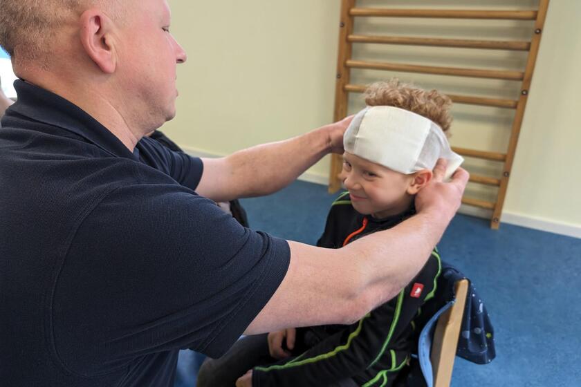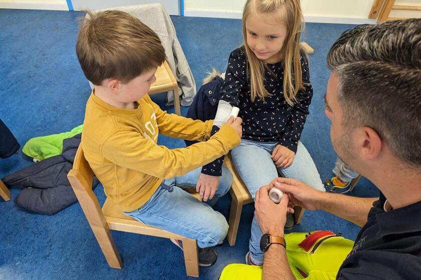 Zwei Gruppen zu je neun und 12 angehenden Schulkindern stellten viele Fragen und wickelten fleißig Verbände um die Köpfe und Beine ihrer Kindergartenfreunde.