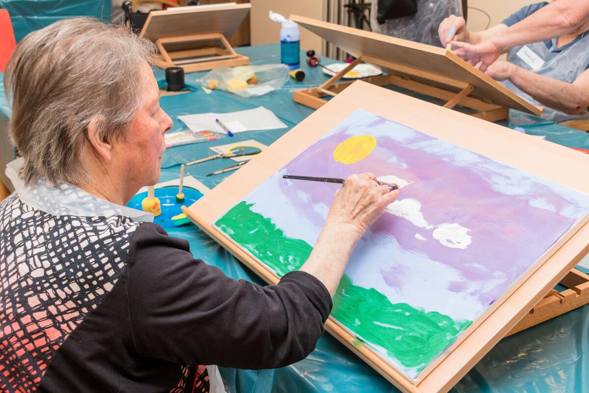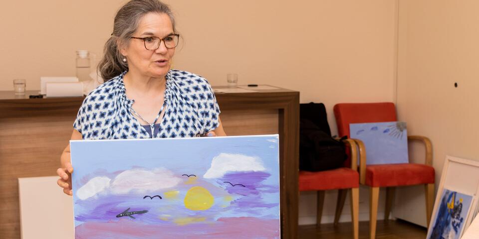 Mut zur Farbe, Mut zum persönlichen Ausdruck, Mut zur Kunst, Mut zur Konzentration – es braucht tatsächlich Mut eine weiße Leinwand zum Kunstwerk werden zu lassen! Seit 2011 ermöglicht der Freundeskreis Johanniter-Haus Waibstadt einmal im Jahr eine therapeutische Malaktion. Mit wechselnden Therapeut*innen gelang es nicht nur, immer neu Freude am Umgang mit Farben, Formen, Techniken zu wecken, es entstanden so auch sehr individuelle und ausdrucksstarke künstlerische Werke. Sie zieren Räume, Flure und finden gegen Spenden auch den Weg zu Freund*innen des Hauses. Diese Möglichkeit setzt allerdings voraus, dass die künstlerischen Arbeiten einer breiteren Öffentlichkeit zugänglich gemacht werden. Eine solche Vernissage, eine Ausstellung der aktuellen Werke, kann in diesem Jahr wieder ohne Einschränkungen stattfinden. Lassen Sie sich diesen besonderen Termin am Mittwoch, 26.Juli ab 16:00Uhr nicht entgehen! Maltherapeutin Heidrun Fischer-Hamann hat in ihrer therapeutischen Begleitung die Themen „Sommer“ und „Sommerhimmel“ angeregt, und man darf auf die Ergebnisse gespannt sein. In drei Malgruppen sind interessante Bilder aus neuem Blickwinkel entstanden, denn erstmals konnte man an Tisch-Staffeleien arbeiten und hatte das Entstehen des Werkes direkt vor Augen. Machen Sie sich selbst ein Bild bei der Vorstellung des Malprojekts in der 11.Vernissage, nehmen Sie die Gelegenheit für diese wertschätzende Begegnung wahr, freuen Sie sich an der bunten Vielfalt von Farben und Formen und hören Sie die muntere Musik des Klarinettenquartetts des MV Waibstadt unter der Leitung von Luis Flaig.