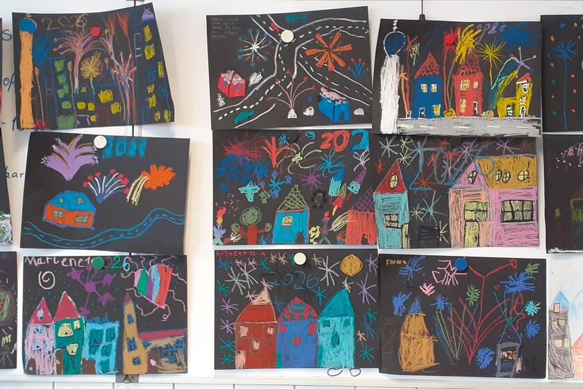 Im Kunstunterricht, am 09.01.2026 gestalteten die Schülerinnen und Schüler der ersten und zweiten Klasse zum Thema Silvester wunderschöne Bilder.