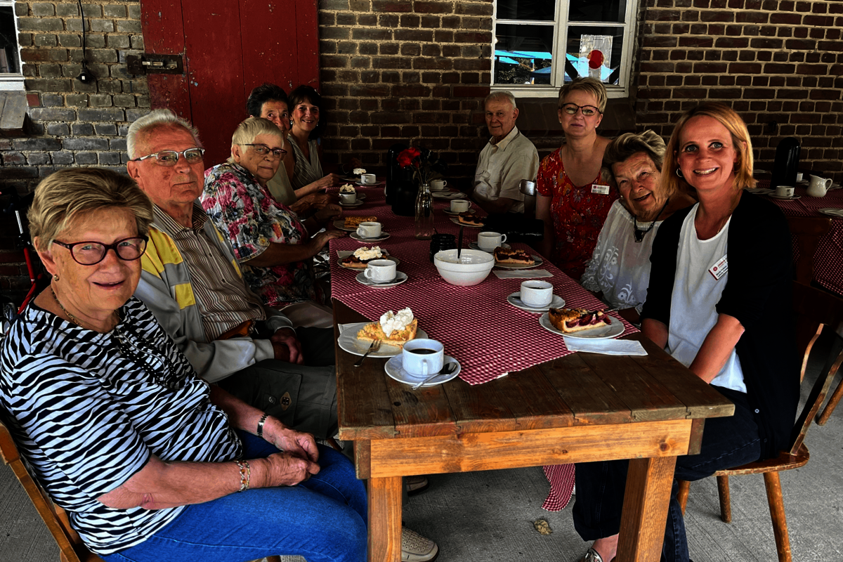Gemeinsam mit Bewohnenden aus dem Johanniter-Zentrum für Pflege und Wohnen in Duisburg-Rheinhausen freuten sich etliche Bewohner/-innen unseres Hauses über einen sommerlichen Aufenthalt zwischen Schloss, Stallungen, Biergarten und Hofladen.