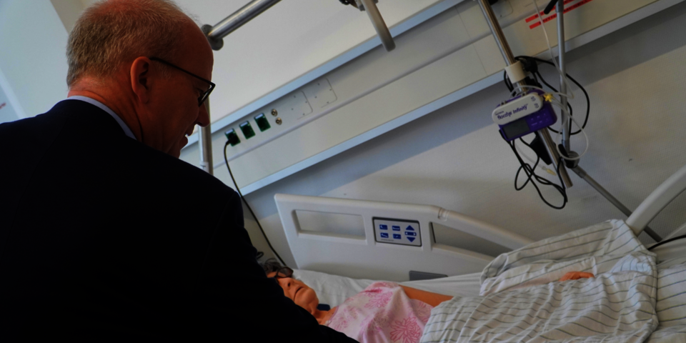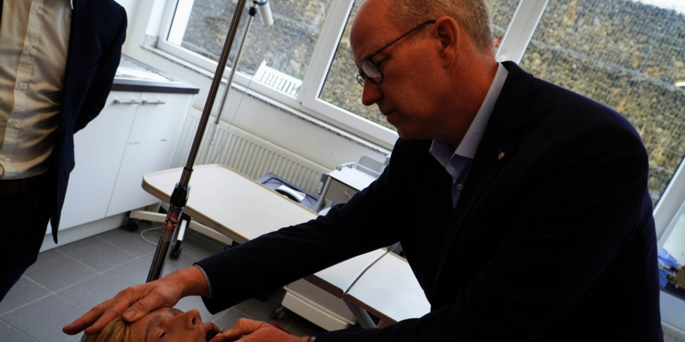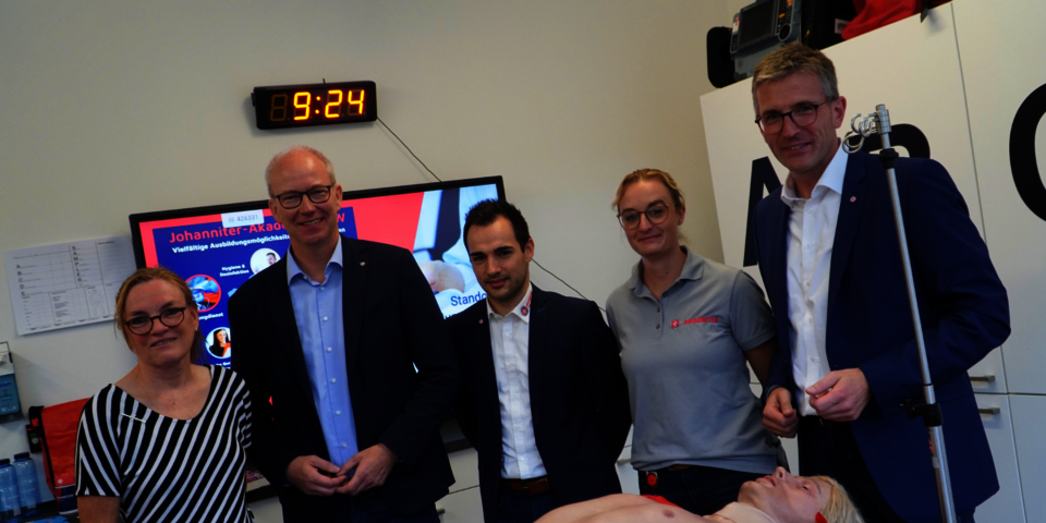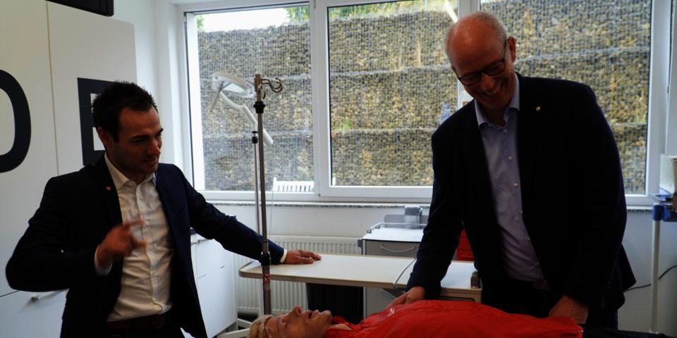 Vor der Diskussion zeigten Sven Blatt, Leiter der Johanniter-Akademie NRW, Heike Achenbach, kommissarische Bildungsbereichsleitung Pflege, Annika Landmeier, Leiterin der Pflegeschule Münster und Philipp Rocker, Leiter der Rettungsdienstschule Münster, Daniel Hagemeier die Simulationsmöglichkeiten am Campus Münster. Besonders begeistert war der Landtagsabgeordnete von den nahezu lebensechten Simulationspuppen der Akademie, mit denen die Auszubildenden zum Beispiel Blutdruck messen können oder Reanimationen realitätsnah und ohne Risiken trainieren können.