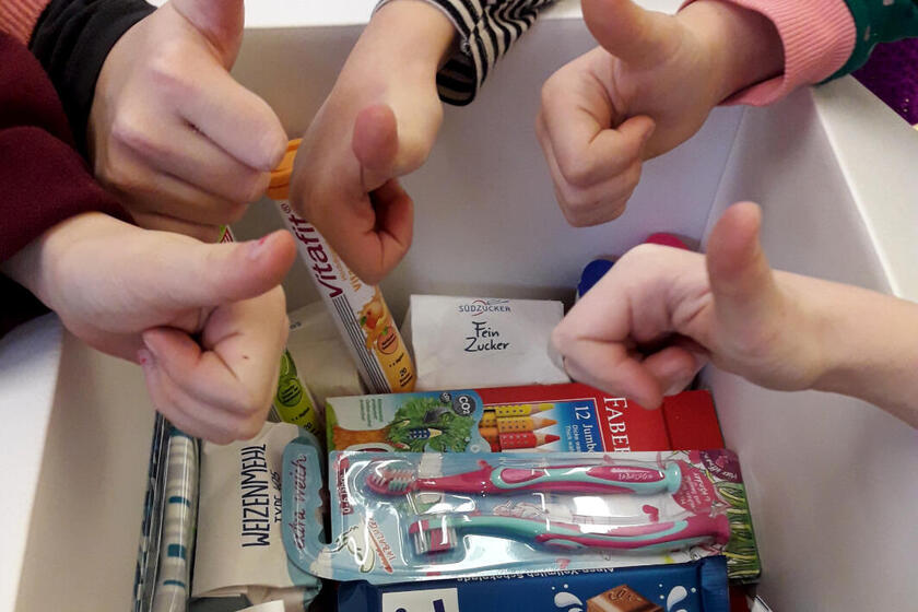 Daumen hoch: Diese Paket ist eines von tausenden, das sich mit den Weihnachtstruckern auf den Weg nach Osteuropa macht.