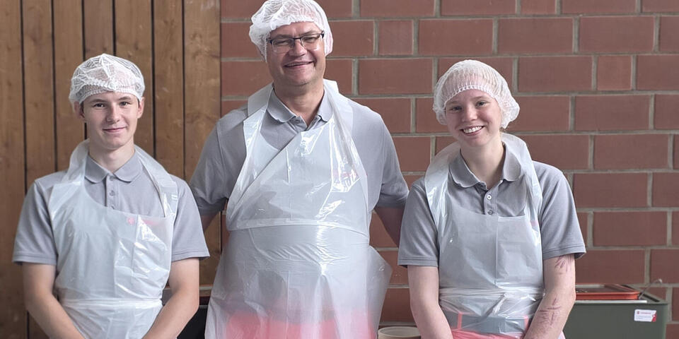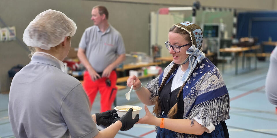 Weil die Osnabrücker Johanniterinnen und Johanniter beim Stand und diversen anderen Diensten eingebunden waren, rückte Unterstützung aus Aurich und Ems-Vechte an. Die Betreuungsgruppen hatten einen Spezialauftrag: Sie verteilten Essen, das die Verpflegungsgruppe des Ortsverbands Jeverland gekocht hatte, an Teilnehmende des Tages der Niedersachsen. Von kleinen Ballettmäuschen über schlagkräftige Kampfsportler bis zum Jesidischen Trachtenverein wurden alle versorgt. Insgesamt wurden 1122-mal Frühstück ausgegeben und 893-mal Mittagessen, davon 235 vegetarische Gerichte. Das zehnköpfige Team aus Ems-Vechte, geführt vom stellvertretenden Ortsbeauftragten Steffen Vieth und Zugführer Tobias Dwucet, kümmerte sich um die Essensausgabe in der OsnabrückHalle. „Das war eine tolle Zusammenarbeit“, betont Vieth und bedankte sich beim Stadthallen-Team für die Ausleihe eines Hubwagens. „Ohne dem hätten wir die Paletten mit den Getränken per Hand schleppen müssen.“ Die Auricher Betreuungsgruppe unter Leitung des Ortsbeauftragten Sebastian Schulze und Thomas Kappenhagen war in der Domschule und gab dort das Essen aus.