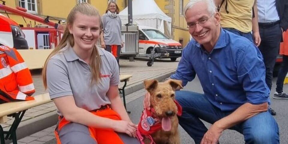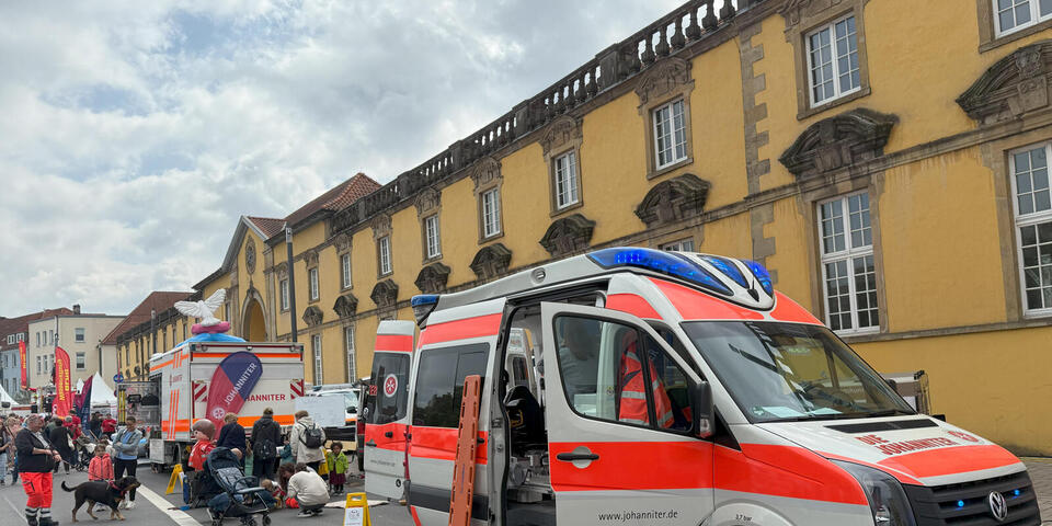 Die Fahrzeuge sind gereinigt, die Bobbycars wieder heile in ihrer Garage angekommen und die vierbeinigen Stars des Johanniter-Standes bei Tag der Niedersachsen haben sich ausgeschlafen. Die Johanniter haben sich beim Tag der Niedersachsen in Osnabrück wieder einmal von ihrer besten Seite präsentiert. Die ehrenamtlichen Helferinnen und Helfern um die Ortsbeauftragte Marita Würth zeigten auf dem Stand auf der Technikmeile auf dem Neuen Graben außergewöhnliche Fahrzeuge wie den Gerätewagen Sanität (GW San), den Einsatzleitwagen (ELW) und den Hundeanhänger der Rettungshundestaffel. Der stand nicht nur leer herum, sondern war gleichzeitig der Pausenraum für die Stars des Johanniter-Auftritts: die Hunde der Rettungshundestaffel mit ihren Hundeführerinnen und Hundeführern. Vor allem die Kinder konnten gar nicht genug bekommen von den schlauen, in der Menschenrettung ausgebildeten Vierbeinern. Auch ältere Semester entdeckten das Kind in sich, wenn Mette und ihre Freunde sie begrüßten. Sowohl Daniela Behrens, Innenministerin des Landes Niedersachsen, Osnabrücks Oberbürgermeisterin Katharina Pötter (CDU) als auch der CDU-Bundestagsabgeordnete Dr. Mathias Middelbergbesuchten den Stand der Johanniter, plauderten mit den Ehrenamtlichen und streichelten die Hunde. Die freuten sich über so viel Aufmerksamkeit. Daniela Behrens war besonders angetan von Therapiehund Henry, der mit den Kindern um kleine Gewinne würfelte. Frauchen Maria Schröder hatte eigens einen großen Schaumstoffwürfel mitgebracht, mit dem Henry die Gewinnzahlen erwürfeln konnte. Terrier-Dame Mette mit Rettungshundeführerin Janne Klotz ließ sich geduldig mit MdB Middelberg fotografieren. Als Star weiß die Terrier-Dame, was sie ihre Fans schuldig ist.
