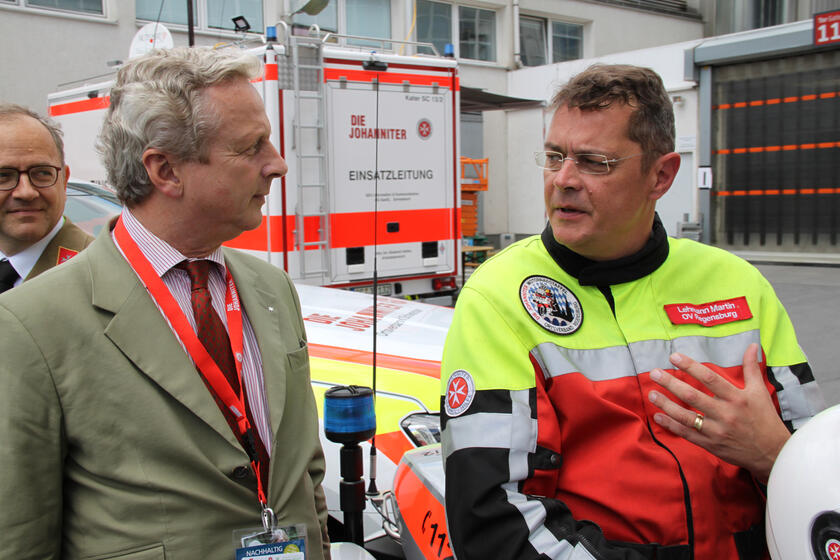 Am Freitag um kurz vor 11 Uhr hieß es: Alle einrücken, Abfahrt für den Kirchentags-Rundgang. JUH-Einsatzleiter Andreas Kleff führte den Herrenmeister des Johanniterordens, S.K.H. Dr. Oskar Prinz von Preußen, und seine Begleitung auf dem traditionellen Rundgang über den Kirchentag. An mehreren Stationen präsentierte Kleff, wie vielfältig die Johanniter zum Gelingen des 37. Deutschen Evangelischen Kirchentages (DEKT) in Dortmund beitragen.