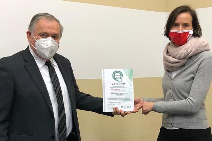 Im Zuge einer Ausschreibung über Fahrdienstleistungen hatten sich Bereichsleiterin Katrin John sowie der Erfurter Fahrdienstleiter Michael Hahn und seine Mitarbeiter Jessika Müller und René Werner dem DEKRA-Prüfverfahren gestellt - und es erfolgreich bestanden. Der Kriterienkatalog "Sicherer Kranken- und Behindertentransfer" umfasst Fragen zur Organisation des Fahrdienstes, Arbeitsschutz-, Hygiene- und Schulungskonzepten und stellt die Ausstattung der Fahrzeuge ebenso auf den Prüfstand wie den Umgang der Mitarbeitenden mit den speziellen Bedürfnissen und Anforderungen von Fahrgästen mit Behinderung.