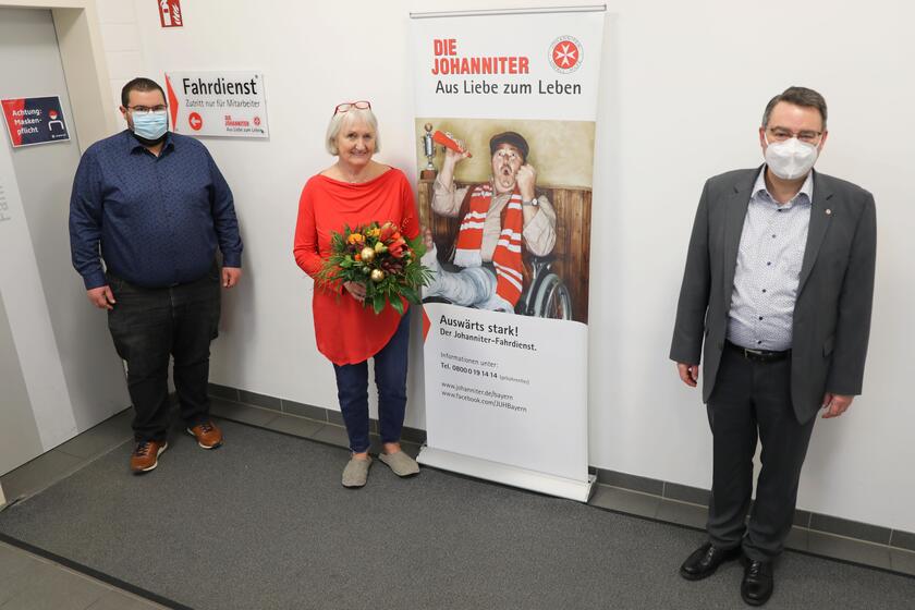 Regensburg ■ Sybille Engels ist eine erstaunlich engagierte Frau. Mit 67 Jahren hat sie bei den Johannitern angefangen - andere gehen in diesem Alter in die Rente. Mit 76 geht sie schließlich nun nach fast zehn Jahren in den wohlverdienten verspäteten Ruhestand. Deshalb kam Regionalvorstand Martin Steinkirchner zur Fahrdienst-Dienststelle in der Grünthaler Straße und überreichte Sybille Engels einen großen Blumenstrauß, und von ihrem Kollegium aus der Abteilung bekam sie noch einen Gutschein überreicht.