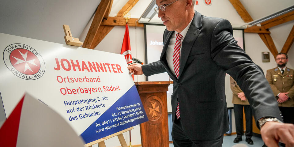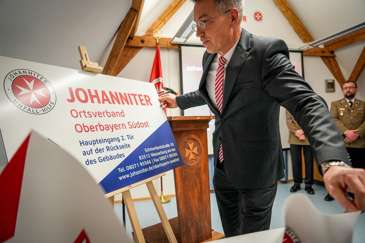 Der Johanniter Ortsverband Wasserburg trägt seit 1. Februar einen neuen Namen: Jetzt heißt er Ortsverband Oberbayern Südost. Landrat Otto Lederer und Wasserburgs Bürgermeister Michael Kölbl haben den neuen Namen am Mittwochabend symbolisch enthüllt.