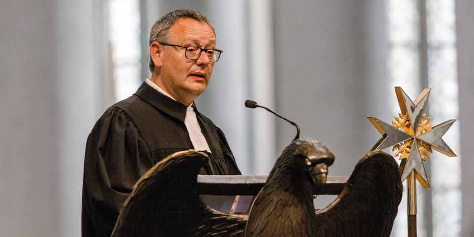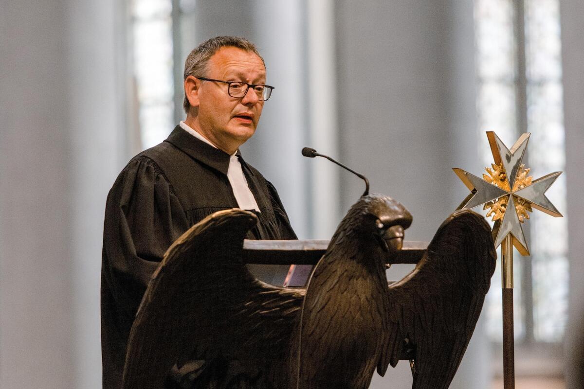 JUH-Präsident Volker Bescht wies in seinem Grußwort auf die großen Herausforderungen der JUH hin: Digitalisierung, Fachkräftemangel, neue Lebensbedingungen nach Corona und die krisenbedingte Überlastung der Mitarbeitenden. Er sicherte Matthias Cramer und Udo Schröder-Hörster als "starkem Führungsduo" der Johanniter die volle Unterstützung zu und wünschte "Gottvertrauen und Zuversicht".