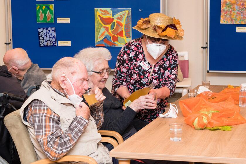 Was meist auch ein Ereignis für Angehörige, Besucher und Ehrenamtliche war, kann seit Beginn der Corona-Pandemie nur noch im häuslichen Kreis der Bewohnerinnen und Bewohner stattfinden. Und da werden diese kleinen, aber feinen jahreszeitlichen Feste gepflegt. Mitarbeiter aus Betreuung und Pflege und aktivierte Bewohnerinnen und Bewohner wirken mit, wenn es darum geht, Fröhlichkeit und gute Laune zu zaubern. Kai Schramm konnte die Wohngemeinschaft zum diesjährigen bunten Herbstnachmittag begrüßen und Silvia Weis führte durch das Programm. Mit Liedern, Rätseln, Reimen, Geschichten und Gedichten wurde ein goldener Herbst beschworen, und mit neuem Wein und warmem Zwiebelkuchen endete ein vergnüglicher Herbstnachmittag.