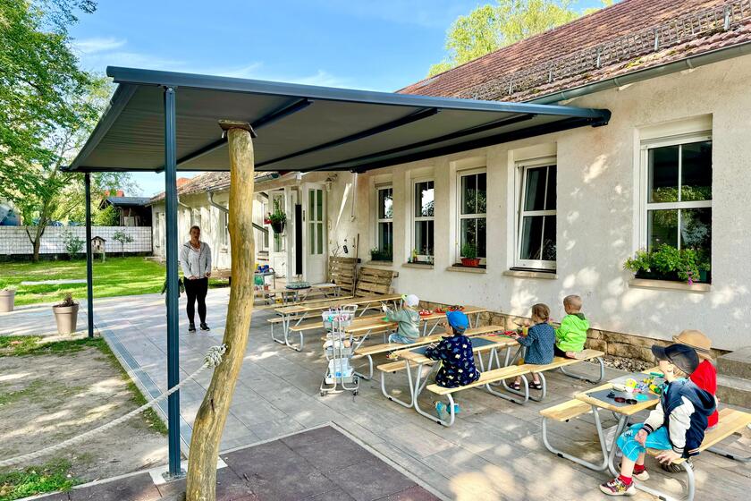 Im letzten Jahr wurde eine Markise für den Kindergarten Wichtelburg beantragt, die über den Haushalt der Gemeinde finanziert wurde. Obwohl der genaue Gesamtpreis nicht bekannt ist, da dies vor meiner Zeit geschah, freuen wir uns sehr über die positive Veränderung. Nach der Neugestaltung des Außengeländes der Wichtelburg mit der neuen Terrasse konnten wir den diesjährigen Sommer im angenehmen Schatten der Markise verbringen. Die Kinder haben den neu geschaffenen Platz intensiv genutzt und genossen die Möglichkeit, draußen im Schutz der Markise zu spielen und zu basteln.