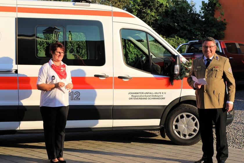 Johanniter-Regionalvorstand Martin Steinkirchner überreichte den Schlüssel an die Ortsbeauftrage Andrea Scherübl im Beisein von Ehrengästen und Mitgliedern des Ortsverbandes. Er betonte, dass der Ortsverband nicht zuletzt durch die herausragenden Leistungen als SEG (Schnelleinsatzgruppe) Verpflegung nicht nur bei den Einsatzkräften der Region, sondern sogar bundesweit einen guten Ruf genieße. Deswegen sei ihm und seinem Regionalvorstands-Kollegen Dr. Hermann Hilber der Entschluss, den OV mit dem neuen Fahrzeug zu unterstützen, sehr leicht gefallen.