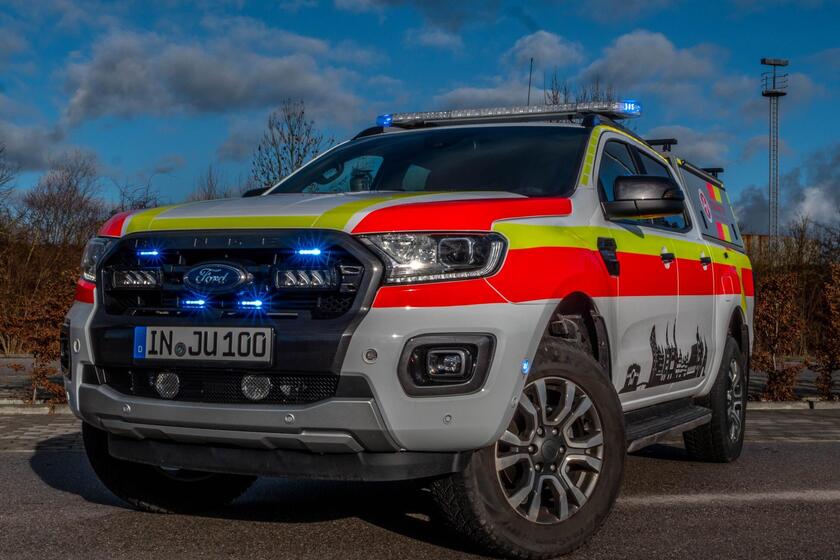 Neben einer modernen Sondersignalanlage in LED Technik und Umfeldbeleuchtung, befinden sich auch ein Notfallrucksack, Verkehrssicherungsmaterial und ein mobiles Flutlicht auf dem Fahrzeug. Und erstmalig zeigen wir bei unserem Beklebungskonzept auch bildlich, wo das Fahrzeug beheimatet ist - die Stadtsilhouette von Ingolstadt ziert das Auto auf beiden Seiten.