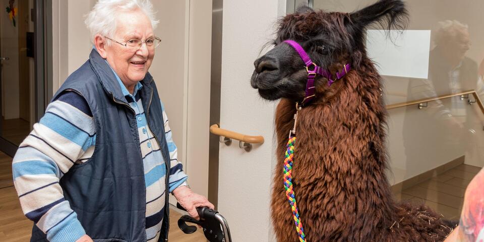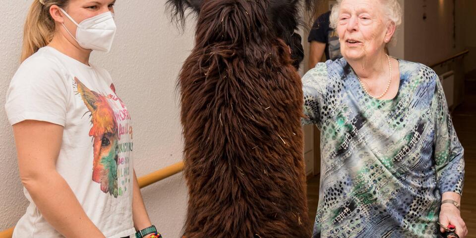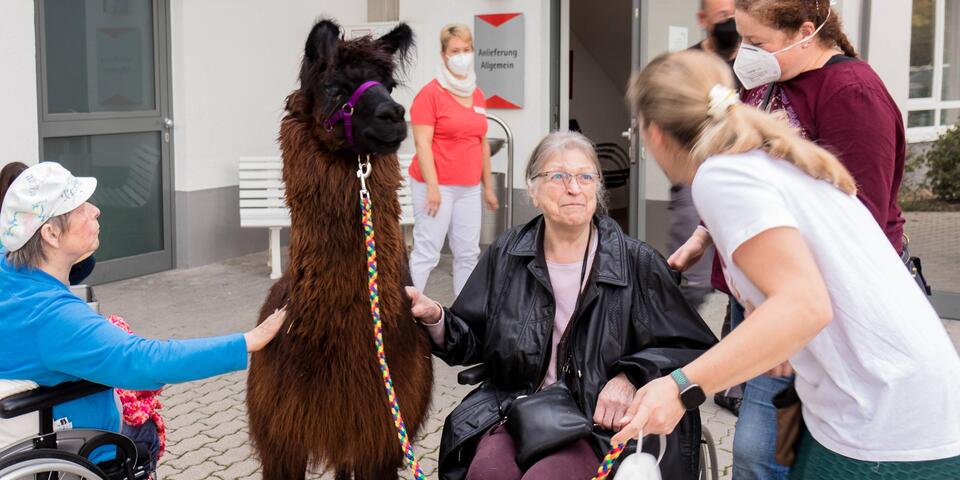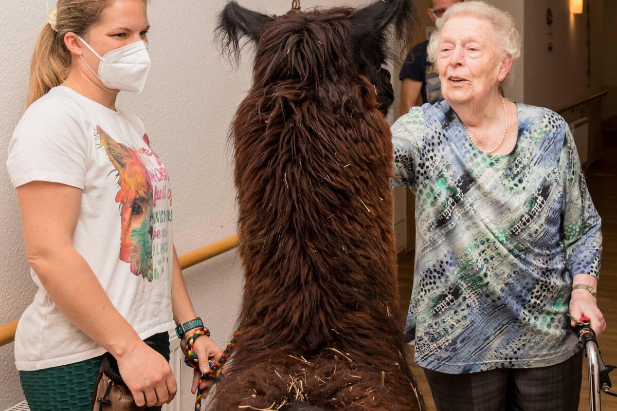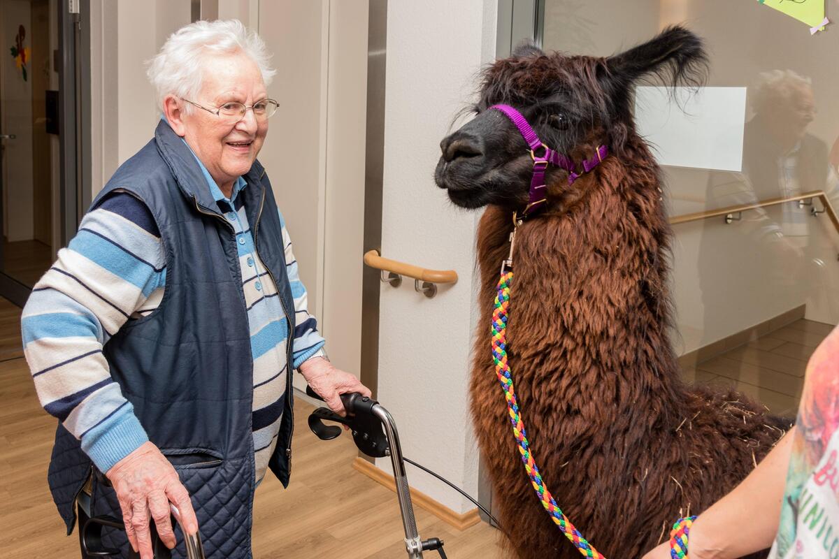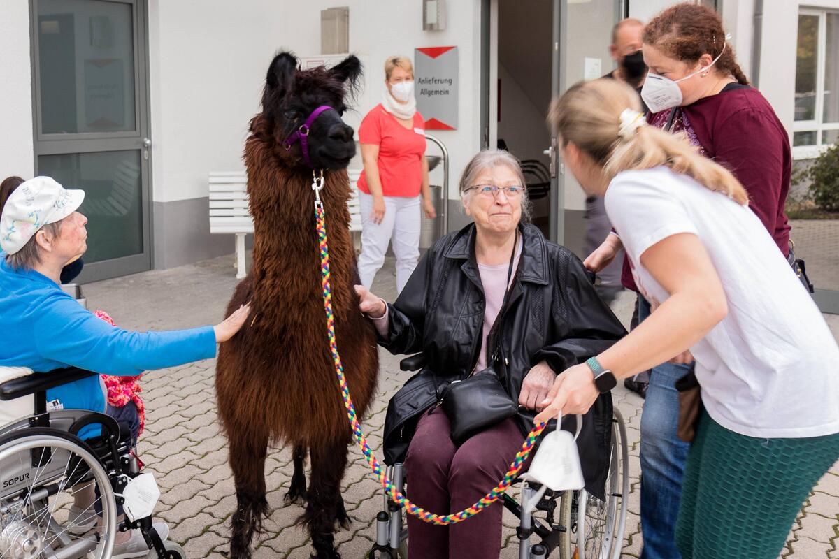 Besuch ist immer willkommen, und wenn es tierischer ist, hält sich die Neugier auf beiden Seiten die Waage. So konnte man es beobachten beim Besuch von eleganten exotischen Vierbeinern im Johanniter-Haus Waibstadt. Annabelle und Kari, zwei Huarizo-Stuten und Campino, ein junger Alpakahengst von „Nonies Hof“ in Neckarbischofsheim trippelten hocherhobenen Hauptes, mit großen Augen neugierig in die Runde blickend aus ihrem Transporter auf den Parkplatz. Dort hatten sich bei spätsommerlicher Wärme die Bewohnerinnen und Bewohner der Einrichtung und auf Grund der Kooperation auch die Kinder des Städtischen Kindergartens erwartungsvoll versammelt. Jubel sollte keiner ausbrechen, denn Alpakas, Lamas und Huarizos, eine Kreuzung aus beiden, sind eigentlich Fluchttiere. Aber sie tragen die Ruhe in sich und wirken so auch beruhigend auf uns Menschen. Das spürten vor allem auch diejenigen, die von Eva Tietz und der dunkelbraunfelligen Annabelle auf den Zimmern besucht wurden. Wirkliche Streichel- oder gar Schmusetiere sind diese Bewohner der Anden nicht, aber als Adrian Tietz und die kleine Tochter Leonie immer wieder Campino und Kari über den Platz führten, siegte die beiderseitige Neugier und die Berührungsängste schwanden. Löwenzahnblätter wurden geknabbert, ein Griff in die dichte Wolle wurde als angenehm empfunden. Die ruhigen Begegnungen haben den Seniorinnen und Senioren sichtlich gut getan.