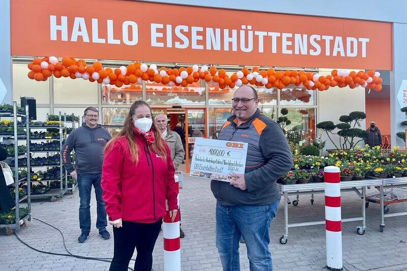 Im Rahmen der Eröffnungswoche des neuen OBI-Baumarktes in Eisenhüttenstadt wurden 5x 1.000 € an ansässige Vereine gespendet. Eileen Samol, Koordinatorin des Ambulanten Kinderhospizdienstes NORA der Johanniter, bekam am Mittwoch vom Marktleiter Christian Hansch den Spendenscheck überreicht.
