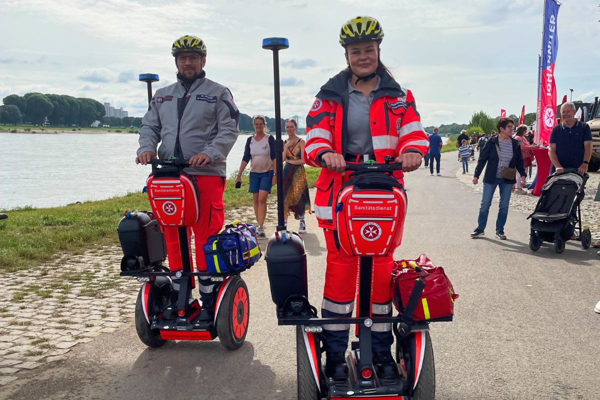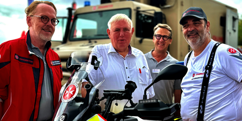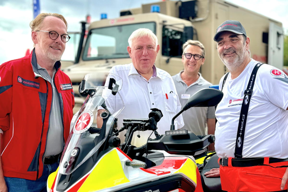 Besucherinnen und Besucher konnten an den Ständen der Johanniter nicht nur viel über deren Arbeit erfahren, sondern auch praktische Einblicke in die Ausrüstung und die beeindruckenden Fahrzeuge aus dem Rettungsdienst und Bevölkerungsschutz erhalten. Die Johanniter hatten einen hochmodernen Rettungswagen, ein Polaris Quad aus dem Katastrophenschutz, medizinisch ausgestattete Rettungssegways und einen Unimog Krankenkraftwagen (KrKw) des Landesverbands NRW auf der Fläche ausgestellt, die von den interessierten Gästen ausgiebig inspiziert wurden. Alle motorradbegeisterten Besucherinnen und Besucher waren zudem beeindruckt von einem besonderen Ausstellungsstück aus dem Regionalverband Niederrhein: eines der ersten vollelektrischen E-Motorräder einer deutschen Hilfsorganisation - die Zero DSR / X. Ein weiteres Highlight erwartete die Besuchenden am Samstag in Form der Johanniter-Rettungshundestaffel, die live am Stand ihr Können unter Beweis stellte. Am Sonntag wurde das vielfältige Angebot der Johanniter noch durch die Präsentation ihrer Hospizarbeit erweitert - eine leise, aber sehr wichtige Arbeit für Menschen auf dem letzten Lebensweg.