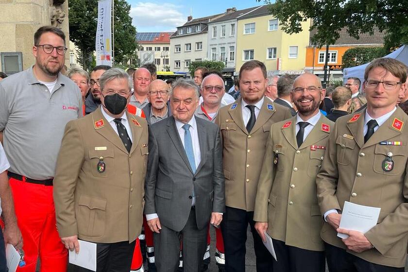 In Rheinbach nahmen die Johanniterinnen Stefanie Krupke, Luisa Mertens und ihr Team vom Projektbüro Hochwasserhilfe am Gottesdienst der Stadt und der anschließenden Kranzniederlegung teil. Die Stadt bedankte sich mit einer Veranstaltung bei Helfenden und Hilfsorganisationen für den großen Zusammenhalt und die enorme Unterstützung. Ralf Henscheidt moderierte eine Veranstaltung, in der sich zahlreiche Gäste an die schreckliche Flutnacht erinnerten.