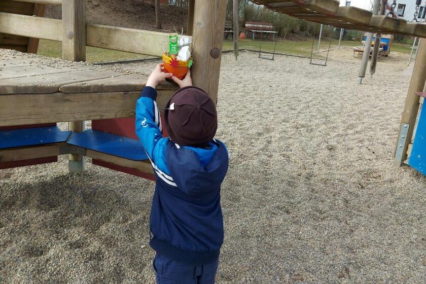 Zuerst durften die Kinder der Notbetreuung eigenständig Osternester basteln und gestalten. Anschließend wurden die Nester versteckt und die Kinder durften sich freudig im Außenbereich des großen Kindergartens auf die Suche machen.