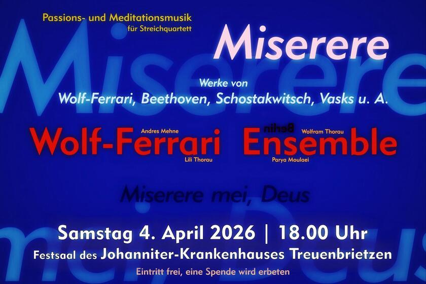 Das Wolf-Ferrari Ensemble spielt wieder eine Passionsmusik für Streichquartett. Sie vereint in diesem Jahr Werke aus fünf Jahrhunderten unter dem Titel „Miserere“. Dabei treffen originale Quartettsätze aus der Klassik, Romantik und Moderne auf Arrangements von Vokalmusik aus Barock und Renaissance, die den weltlichen Konzertwerken einen inhaltlichen Bezug geben. Als wiederkehrendes Element erklingen Zwischenspiele des von vielen Komponisten für die Finstermetten der Karwoche vertonten „Miserere mei, Deus“. In der besonderen Intensität und Klarheit des konzentrierten, vierstimmigen Satzes der Streichinstrumente erzählen die rein instrumental gespielten Werke von Klage, Trauer und Abschied aber gleichzeitig auch von Trost, Erlösung und Hoffnung. Weltliche und geistliche Musik wachsen zu einer eindringlichen Stunde der Meditation zusammen, die die Gedanken der Passionsgeschichte aufgreift und verarbeitet.