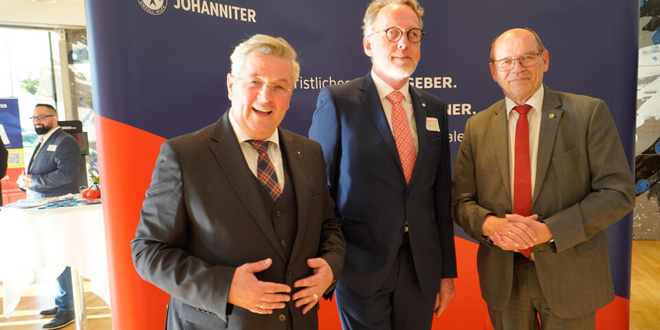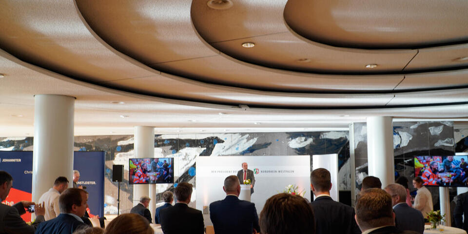 Landtagsvizepräsident Rainer Schmeltzer (SPD) bedankte sich in seinem Grußwort für die verlässliche, stets professionelle Zusammenarbeit und hob den Wert der anerkannten Hilfsorganisationen und ihrer ehrenamtlichen Arbeit für zentrale Politikfelder hervor. Die Johanniter seien der "Mörtel der Mauer für unsere Demokratie" und entwickelten durch ihr breites Aufgabengebiet zukunftsträchtige Bereiche der Gesellschaft weiter, wofür er großen Respekt und Dankbarkeit verspüre, sagte Schmeltzer. Im Anschluss blickten Udo Schröder-Hörster und Matthias Cramer vom NRW-Landesvorstand auf unterschiedliche Tätigkeitsfelder der Johanniter, über deren Entwicklung im hohen Haus in Düsseldorf stets mitentschieden wird.