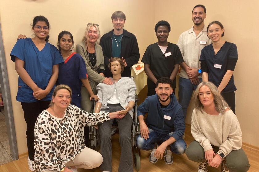 Die Auszubildenden und die Praxisanleitung im Johanniter-Stift Wuppertal freuen sich über ihre neue Pflegepuppe, die speziell für die Ausbildung der über 20 angehenden Pflegekräfte im Haus angeschafft wurde. Die Puppe, liebevoll "Lieselotte" getauft, wurde zunächst sorgfältig eingekleidet und frisiert. In Zukunft können die Auszubildenden mit Lieselotte eine Vielzahl an pflegerischen Aufgaben praktisch üben – von der richtigen Lagerung und dem Transfer bis hin zur Verabreichung von Injektionen und dem Legen von Kathetern. Lieselotte bietet ihnen eine wertvolle Möglichkeit, wichtige Fertigkeiten realitätsnah und sicher zu trainieren.