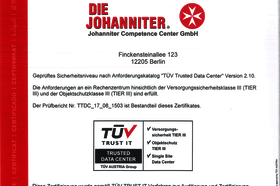 Die Johanniter Competence Center GmbH hält mit der Re-Zertifizierung weiterhin das TIER III Level bei der Versorgungssicherheit und TIER III Level beim Objektschutz. Die Versorgungssicherheit beinhaltet die Bereiche Klimatechnik und Elektrotechnik. Der Objektschutz beinhaltet die Bereiche Brandschutz und Einbruchmeldeanlage/ Zutrittskontrolle. TIER III Level steht hierbei für die international anerkannte zweithöchste Zertifizierungsklasse. Jede der vier erreichbaren TIER-Stufen geben jeweils Auskunft über die Hoch- und Höchstverfügbarkeit eines Rechenzentrums. Mit Erreichen des Sicherheitslevel TIER III wurde dem Rechenzentrum der Johanniter Competence Center GmbH eine 99,98% Verfügbarkeit im Rahmen der geprüften Schutzziele durch den TÜV bestätigt.