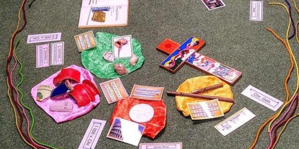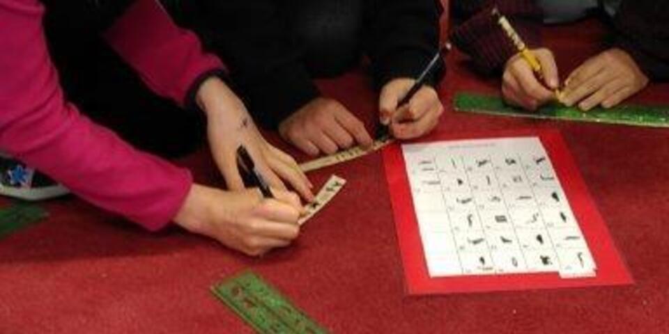 Sie erforschten, wo die Anfänge unserer Schrift liegen. So ging es von den Höhlenmalereien der Steinzeit über die Entwicklung unseres Alphabets und die Entstehung des Buchdrucks bis in die Neuzeit. Die Kinder konnten sich Schreibgeräte und Materialien anschauen, die in den verschiedenen Epochen genutzt wurden, und dadurch nachempfinden, wie kostbar beispielsweise ein mit der Hand auf Pergament geschriebenes Buch gewesen sein muss. Fasziniert zeigten sich die Schülerinnen und Schüler von den Hieroglyphen der Ägypter. Diese Bilderschrift konnten sie selbst ausprobieren und damit ein Lesezeichen aus Pergament verzieren.