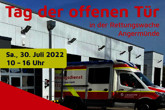 Am Samstag, den 30. Juli 2022, lädt der Regionalverband Nordbrandenburg der Johanniter-Unfall-Hilfe e.V. in der Zeit von 10-16 Uhr zum Tag der offenen Tür in der Rettungswache Angermünde ein.