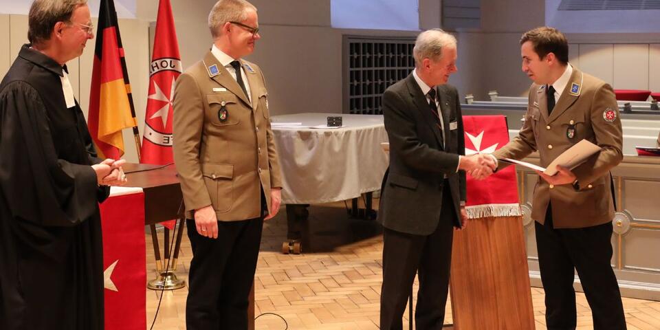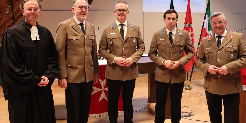 Marvin Adels und Dr. Axel Kallmayer sind vom NRW-Landesvorstand der Johanniter-Unfall-Hilfe e. V. zu neuen Mitgliedern des Regionalvorstandes Rhein-Ruhr berufen worden. Die Landesvorstände Matthias Cramer und Udo Schröder-Hörster führten sie Mitte November in der Düsseldorfer Neanderkirche in einem feierlichen Gottesdienst mit rund 250 Gästen in ihr Amt ein. Das Duo führt den Regionalverband mit seinen 450 ehren- und rund 350 hauptamtlichen Mitarbeitenden künftig gemeinsam. Dabei ist Marvin Adels für alle hauptamtlichen Bereiche wie Rettungsdienst, Erste-Hilfe-Ausbildung und Soziale Dienste verantwortlich; Dr. Axel Kallmayer verantwortet unter anderem die wichtigen ehrenamtlichen Aufgaben im Bereich Sanitätsdienst und Bevölkerungsschutz.
