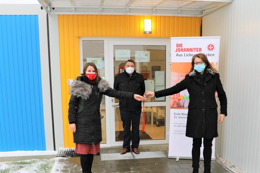 Stellvertretend für die Stadt Schwandorf hat die Zweite Bürgermeisterin Martina Englhardt-Kopf symbolisch den Schlüssel für in Modulbauweise errichtete Erweiterung des Johanniter-Kinderhaus „Welt-Entdecker“ an die Johanniter-Unfall-Hilfe übergeben.