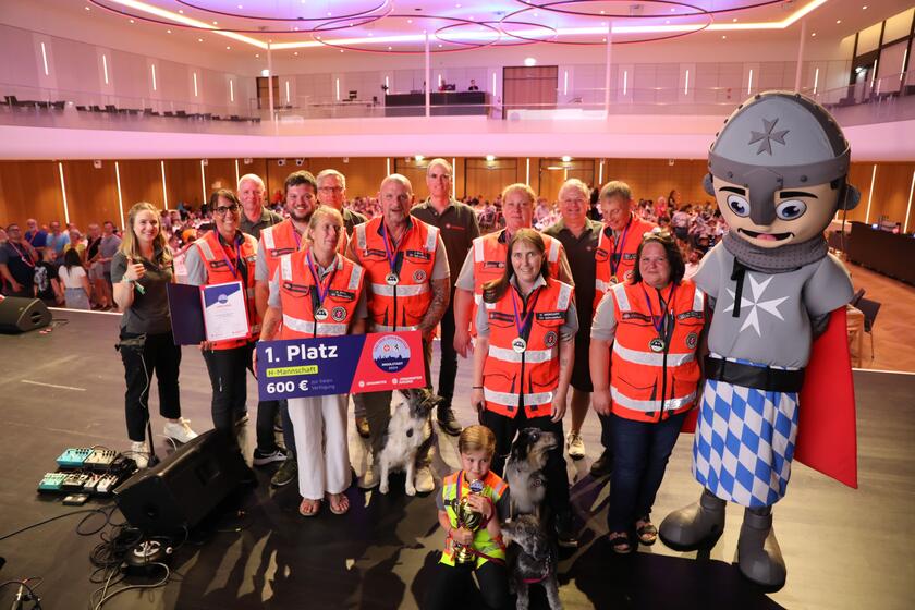Riesenjubel bei der Johanniter-Rettungshundestaffel aus Schweinfurt: Nach dem Sieg beim Landeswettkampf 2022 in Würzburg, konnte das Team aus Schweinfurt beim Landeswettkampf 2024 in Ingolstadt ihren Titel erfolgreich verteidigen. Sie schnitten in Erster-Hilfe erneut als beste H-Mannschaft (Rettungshundestaffel) ab und konnten einen der begehrten Pokale mit nachhause nehmen. Und nicht nur das: Sie dürfen die bayerischen Johanniter, wie schon 2023 in Potsdam, im kommenden Jahr beim Bundeswettkampf in Erfurt vertreten.