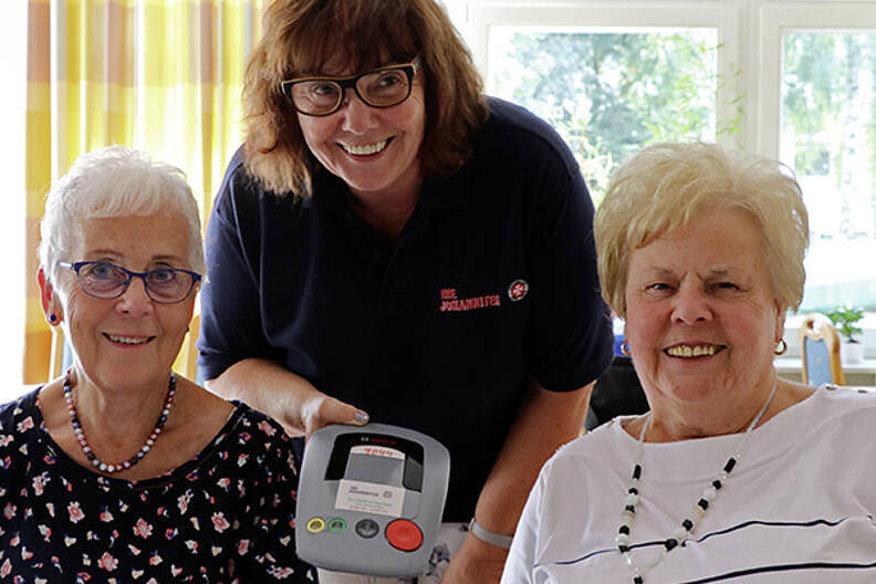 „Vorbildlich!“, findet Gaby Nordahl dies. Denn viele ihrer Kunden machen sich zu spät Gedanken über Sicherheit. „Oft rufen die Menschen bei mir an, nachdem bereits etwas passiert ist“, erzählt die Johanniter-Mitarbeiterin. Sie kennt viele Geschichten, von verletzten Personen, die hilflos in der Wohnung lagen, bis sie jemand gefunden hat. Dann hört sie von den Angehörigen Sätze wie „Jetzt bekommt Oma einen Notfall-System, ob sie will oder nicht!“ Oder die älteren Menschen selbst kommen zu der – für sie oft schmerzlichen – Erkenntnis, dass sie Hilfe und zusätzliche Absicherung brauchen. Eine Möglichkeit weiterhin unabhängig zu leben und trotzdem sicher zu sein, ist der Hausnotruf der Johanniter, den Gaby Nordahl den rund 50 anwesenden Senioren vorstellte. Per einfachen Knopfdruck kann im Falle des Falles Hilfe geholt werden und der Sender ist immer griffbereit als Armband am Handgelenk oder als Anhänger um den Hals. „Der Notrufknopf kann immer gedrückt werden. Egal ob es sich um Nasenbluten, einen Sturz oder einen Einbruch handelt“, betont Nordahl.