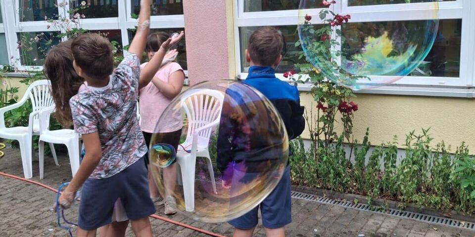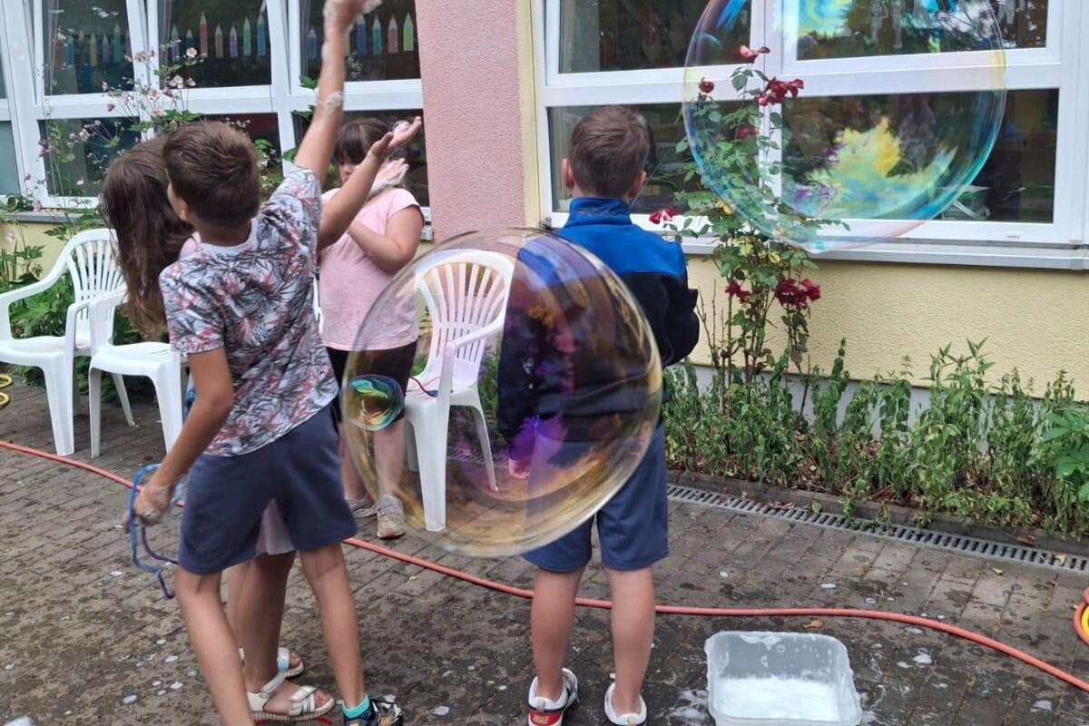 Die Hortkinder starteten gemütlich – mit aufgeräumten Zimmern und guter Stimmung. Danach ging’s richtig los: Wasserspiele & Staffelläufe, Wasserschlacht deluxe, Pool & Wasserrutsche, am Mittwoch wurde es abenteuerlich beim Geocaching im Weißenborner Wald, Donnerstag stand ganz im Zeichen riesiger Seifenblasen – und am Freitag wurde gekickt & gestylt: Die Jungs zeigten ihr Können auf dem Kunstrasen, die Mädels gönnten sich bunte Sommersträhnen.