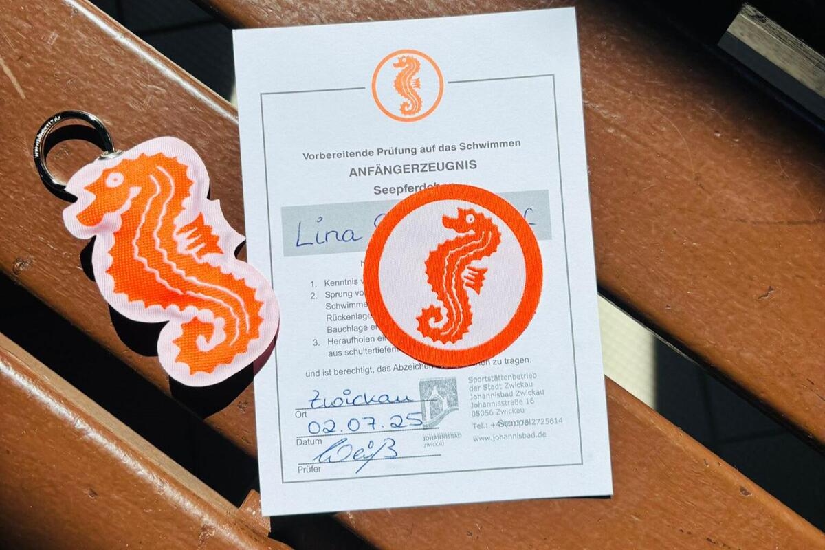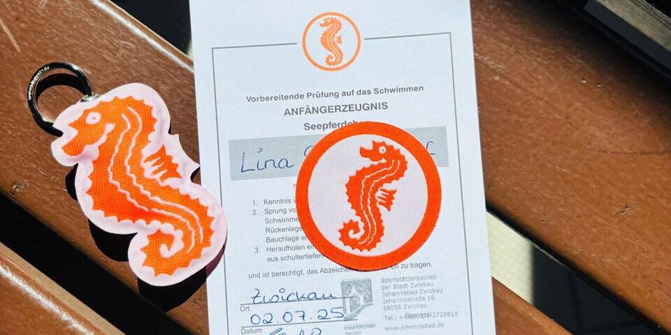 Den ersten großen Erfolg dürfen wir gleich feiern: Eins unserer Kinder hat beim 14-tägigen Aktionstag im Johannisbad das Seepferdchen geschafft!