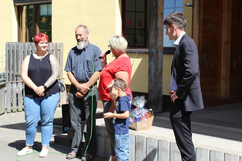 Als Gäste wurden der noch amtierenden Bürgermeister Helmut Wichler begrüßt, der sein Amt alsbald an seine neugewählte Nachfolgerin Lisa Pfaff übergeben wird. Als Dankeschön für die sehr gute Zusammenarbeit in den vergangenen Jahren überreichten die Kinder einen Präsentkorb und präsentierten ein Programm aus Gesang und Tanz. Der Regionalvorstand der Johanniter-Unfall-Hilfe e.V. Philipp Tausch reihte sich mit in die Runde ein und bedankte sich für die gute Organisation bei allen Kindern, Eltern, Sponsoren und dem Team der Kita. Abgerundet hat dieses erfolgreiche Sommerfest das gemeinsame Essen von Bratwürsten und Kuchen.