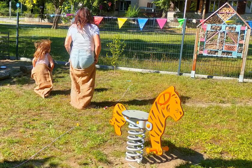 Am Anfang sorgten die Krippen- und Kitakinder für ein kleines Programm, welches den Eltern, Großeltern und Geschwistern vorgeführt wurde. Daraufhin folgte der sportliche Teil des Tages: Unter dem Motto "Klein gegen Groß" waren verschiedene sportliche Stationen für Eltern und Kinder aufgebaut, die es zu bewältigen gab. Beim Sackhüpfen, Enten angeln, Schubkarrenrennen, Gummistiefelweitwurf, Dosenschießen mit Wasserpistole und bei der Götterspeisen-Schatzsuche konnten die Kinder gegen ihre Eltern und großen Geschwister antreten. Natürlich hatten die Kinder immer die Nase vorne.