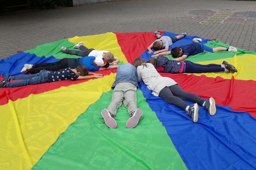 Mit steigenden Temperaturen steigt auch die Zeit, die in der Mittagsbetreuung Obertrubach im Freien verbracht wird. Das schöne Wetter nach Schulschluss lockt alle nach draußen zu Freiluft-Aktionen im Schulhof. Besonders viel Spaß hatten alle mit dem großen, farbenfrohen Schwungtuch und dem neuen „Doppelracer“, der für die ganze Schulfamilie angeschafft werden konnte. Ein Dauerbrenner sind auch die Riesenseifenblasen und die Straßenmalkreiden, mit denen die Schülerinnen und Schüler der Schulhof immer wieder neu und kreativ gestaltet wird. „Uns wird es niiieee langweilig“, fasst Mibet-Leiterin Sandra Stangl fröhlich zusammen.