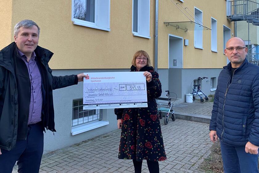 Bürgermeister Laesicke überreichte den Scheck in Höhe von 345,55 Euro heute an die langjährige Einrichtungsleiterin Gabriele Trümner und Regionalvorstand Ralf Opitz. Das Geld wird genutzt, um den Bewohnerinnen und Bewohnern der Obdachloseneinrichtung eine kleine Freude zu bereiten.