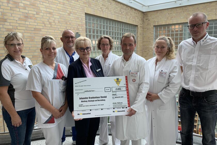 Das Edeka-Center Stendal überbrachte kürzlich eine großzügige Spende für das Onkologische Zentrum des Johanniter-Krankenhauses. Das bei einem Flohmarkt anlässlich seines 30-jährigen Jubiläums gesammelte Geld kommt nun den Krebspatienten zugute. Das Foto zeigt die Übergabe des 2.000-Euro-Spendenschecks mit (von links): Jana Fischer (Edeka), Patricia Grieger, Dr. Guido Kramer, Kirsten Puhlmann (Marktleiterin Edeka), Dr. Beate Koberstein, Dr. Lars Thiele, Manuela Huß und René Kyris (Edeka). Das Onkologische Zentrum ist für Patientinnen und Patienten mit Krebserkrankungen eine zentrale Anlaufstelle für Diagnose und Therapie. Mediziner und Pflegende bieten eine umfassende, ganzheitliche und dauerhafte Betreuung in allen Phasen der Erkrankung.