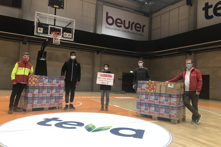 Am 15.12.2020 fand die Übergabe der Päckchen durch den Verein an die Johanniter im Orange-Campus in Neu-Ulm statt. Spieler aus unterschiedlichen Mannschaften, haben eigenständig die Abholung aller Pakete an insgesamt vier Schulen organisiert. Danach hieß es, die Pakete auf Paletten zu stapeln, diese zu folieren und bis zur Abholung zwischenzulagern. Hierbei wurden sie durch Emma Lu Befurt und Lino Santuario, die beide den Bundesfreiwilligen Dienst bei BBU ‘01 absolvieren, unterstützt. Insgesamt konnten 240 Pakete von Michael Sell abgeholt werden.