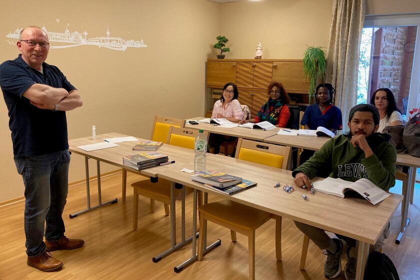 Im Johanniter-Stift Wuppertal absolvieren derzeit 30 Auszubildende ihre Ausbildung, viele von ihnen mit Migrationshintergrund. Um ihnen den Einstieg in den Pflegeberuf zu erleichtern, wird dank der Förderung durch die Johanniter-Stiftung ein spezieller Sprachkurs mit dem Schwerpunkt „Deutsch in der Pflege“ angeboten. Als Dozent konnte Walter Schnatz, eine erfahrene Pflegefachkraft des Hauses, gewonnen werden. Zusätzlich stehen den Teilnehmenden passende Lernmaterialien zur Verfügung, um ihre Sprachkenntnisse gezielt zu verbessern.