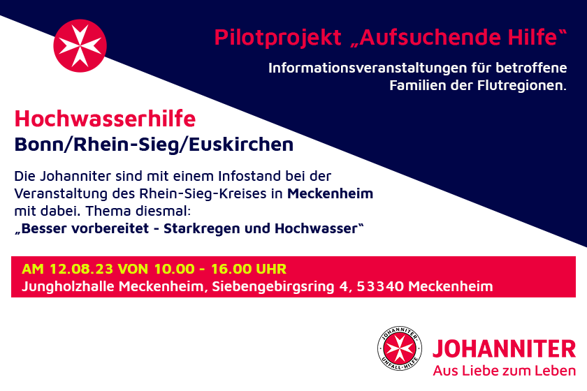 Ziel des Projektes ist es, Betroffene der Flutereignisse über unterschiedliche Hilfsangebote zu informieren und ihnen den Zugang zu diesen zu erleichtern. Auch wir Johanniter unterstützen dabei. Nun findet eine Informationsveranstaltung in Meckenheim statt. Thema diesmal: „Besser vorbereitet! Starkregen und Hochwasser“.