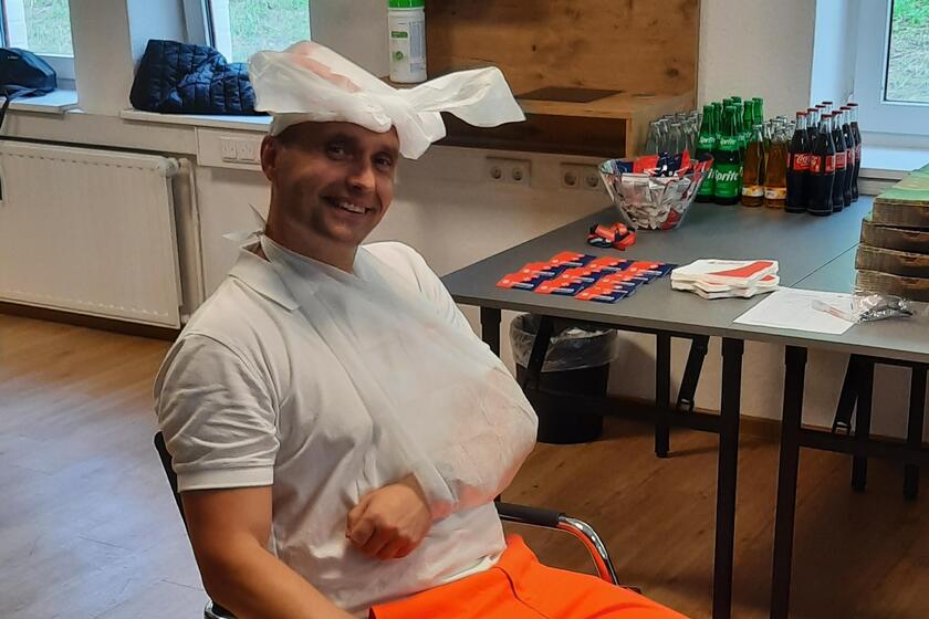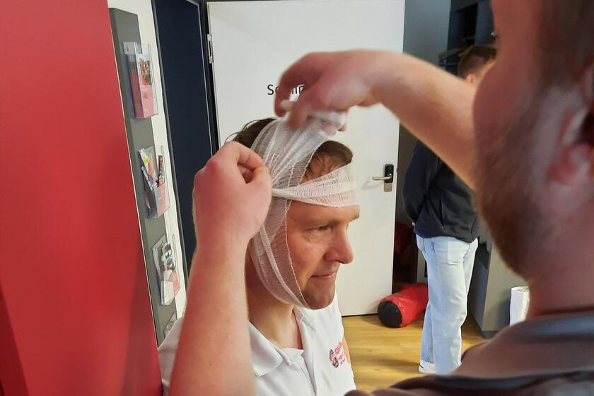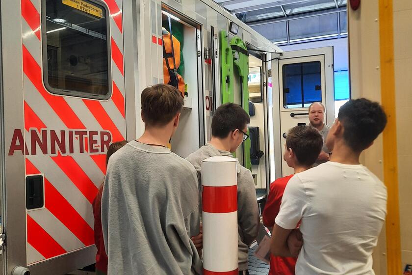 Mit Rettungswagen-Besichtigung, Fingerpflaster kleben, Kopfverbände mit dem Dreieckstuch anlegen und zum Abschluss: Pizza für alle!