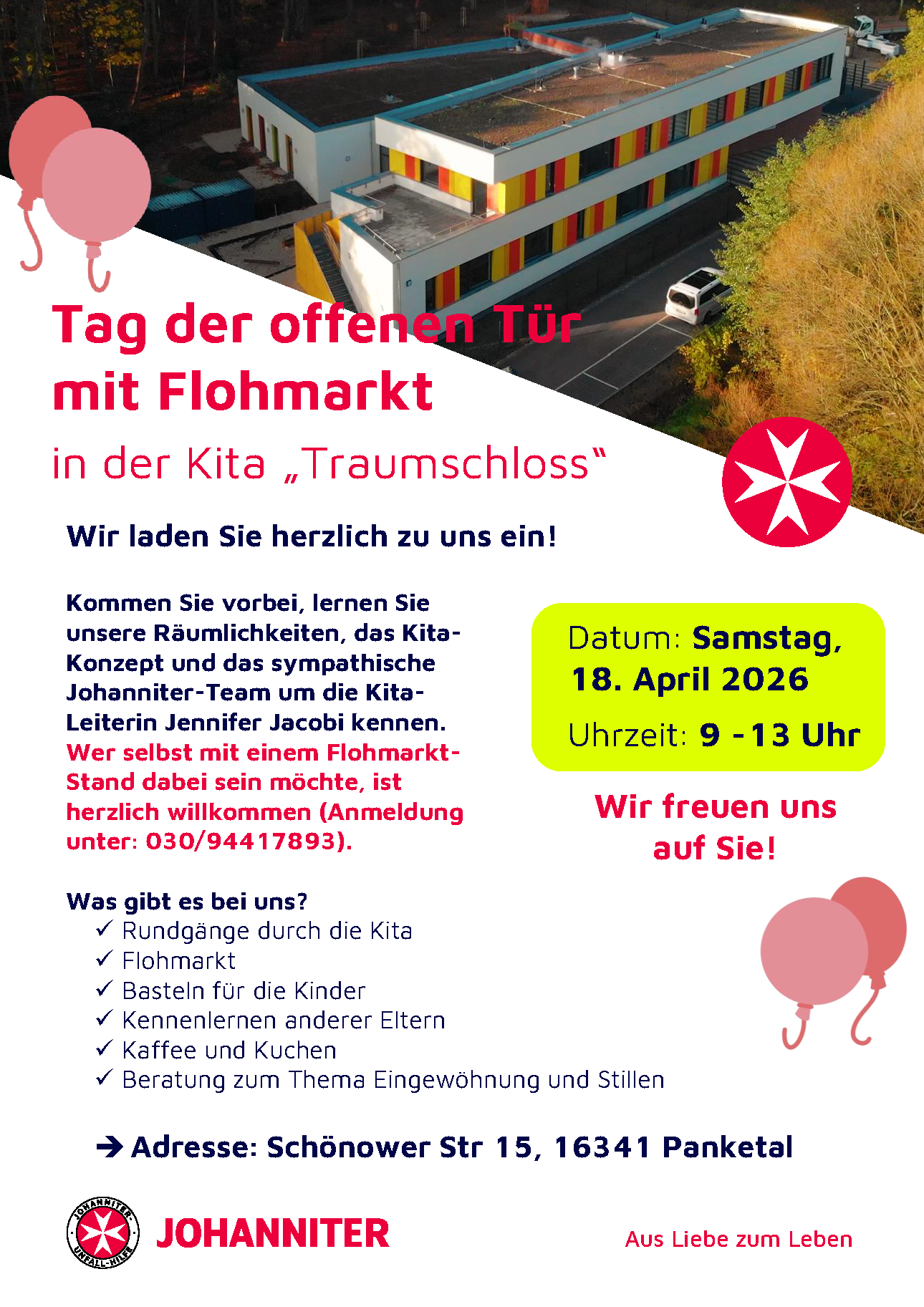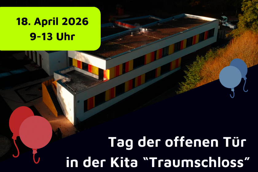 Am Samstag, den 18. April 2026 findet von 9 -13 Uhr der Tag der offenen Tür in unserer Kita "Traumschloss" in Zepernick statt. Wir laden Sie herzlich zu uns ein!