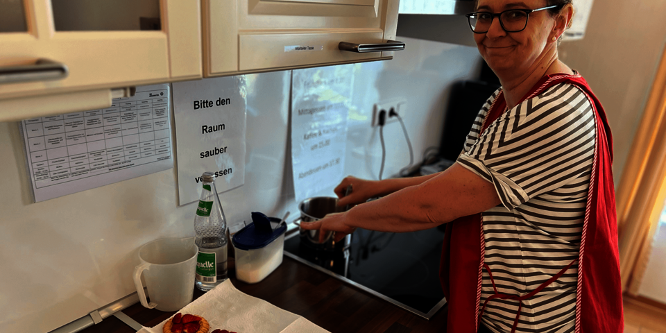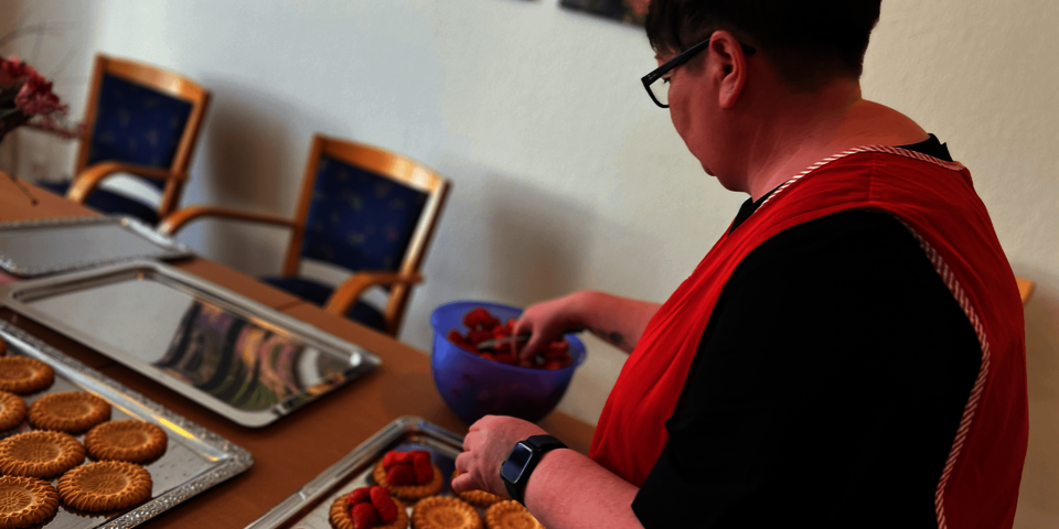 Leicht verwirrt waren die Mitarbeitenden im Johanniter-Stift Duisburg am 12. Mai, als Pflegedienstleiterin Christina Klasmann und Einrichtungsleiterin Alexandra Karwinski mit Schürze und Küchenutensilien ausgestattet in der Mitmachküche auf dem Wohnbereich Erdbeertörtchen produzierten.