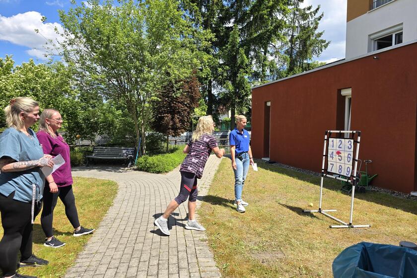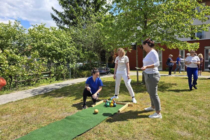 Für Spaß und sportlichen Ehrgeiz sorgten zudem drei Aktivstationen: Beim Kegeln, Ringweitwurf und Ballweitwurf sammelten die Teilnehmenden Punkte in lockerer Wettkampfatmosphäre. Als Hauptpreis winkte ein Gutschein für eine wohltuende Fußpflege – ein kleiner Luxus für alle, die täglich Großes leisten.