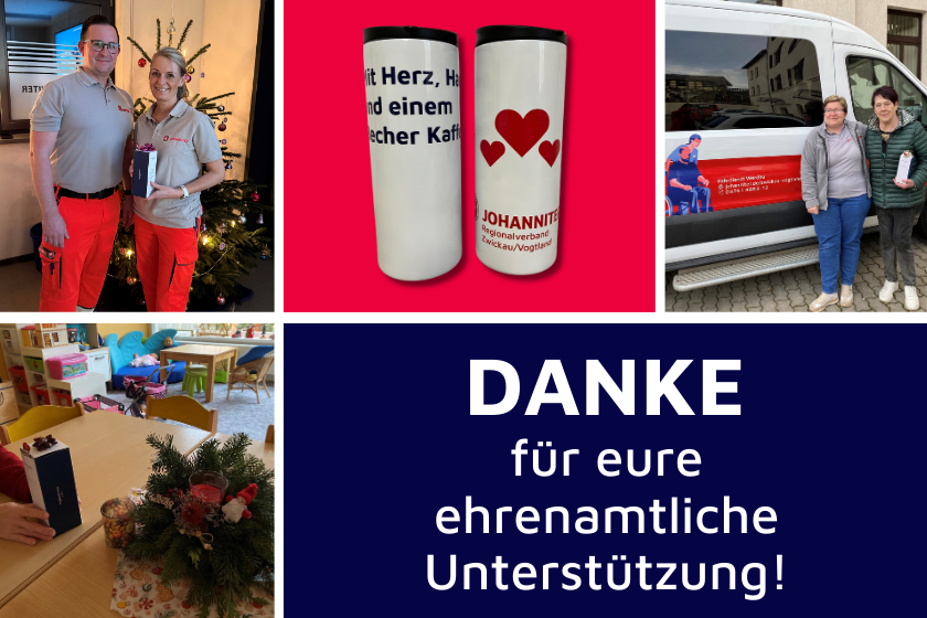 Stellvertretend für unsere zahlreichen Ehrenamtlichen aus den Bereichen Kinder & Jugend, Geflüchtetenhilfe, Einsatzdienste, Soziale Dienste, Fahrdienst, Ausbildung und Katastrophenschutz nahmen Peggy Lindner (Rettungswache Wildenfels/Kirchberg), Ingrid Pansa (Fahrdienst Werdau) und Manuela Wiederhold (Kita Zwickau) ihren Thermobecher entgegen.